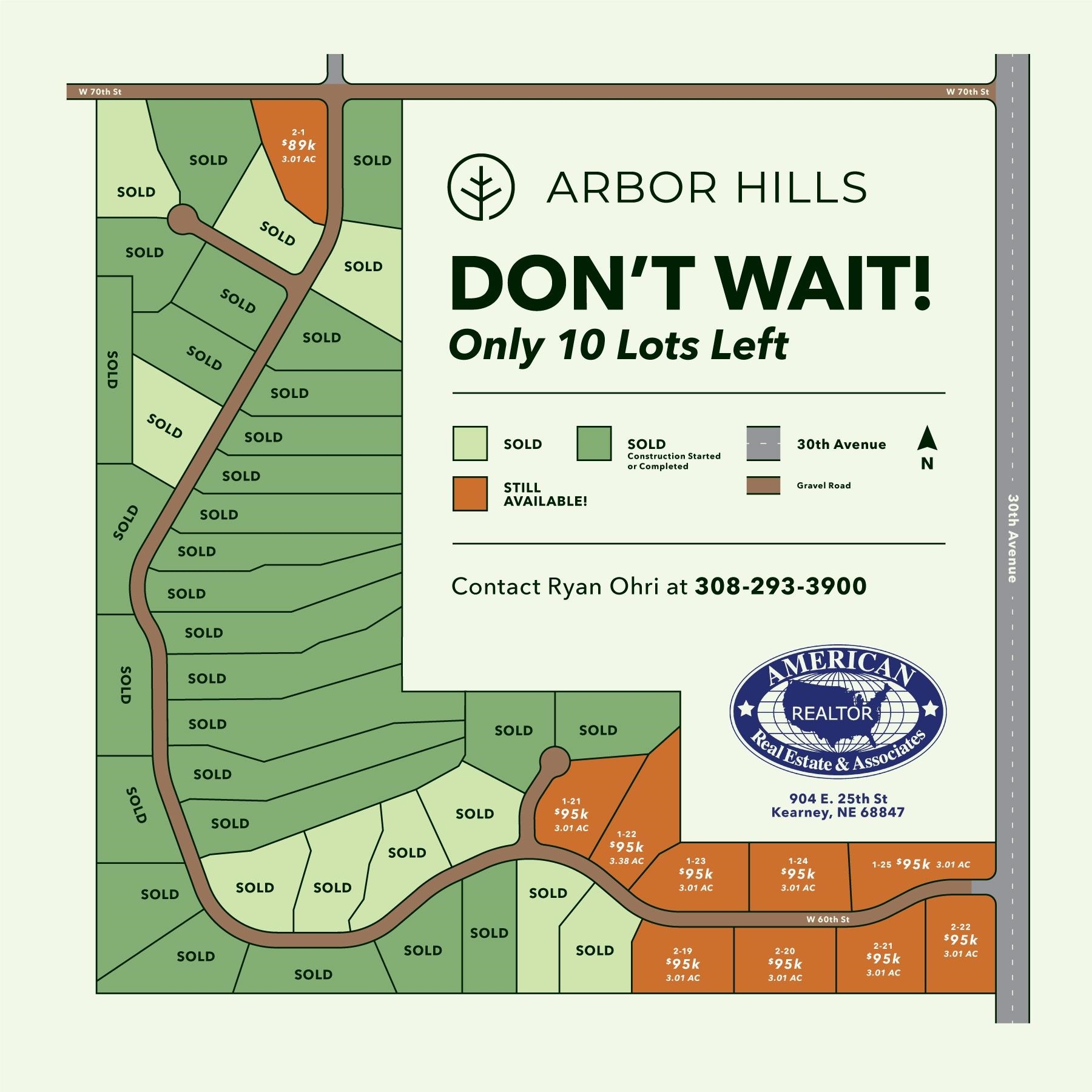 Here is your chance to own a 3 acre lot in a prime location to build your dream home! Located just north and west of 56th Street & 30th Avenue, you are only minutes from Kearney’s city limits. The seller is willing to give a buyer/builder discount if they are interested in purchasing two or more lots (10 Total Lots Available). This gently rolling, spacious lot, offers the perfect blend of convenience and tranquility. Nestled in a quiet subdivision yet close to all the amenities of town, it’s the ideal location for your new construction project. All important utilities have already been run to each individual lot to include electric (400amp), natural gas (which is not common), and both cable and fiber optic are on site as well. Perfectly suited for a walk out basement design, the topography of this subdivision allows for your new home to follow the natural rolling hills of the countryside with plenty of room to situate the layout that you like best. Look no further than Arbor Hills Subdivision!