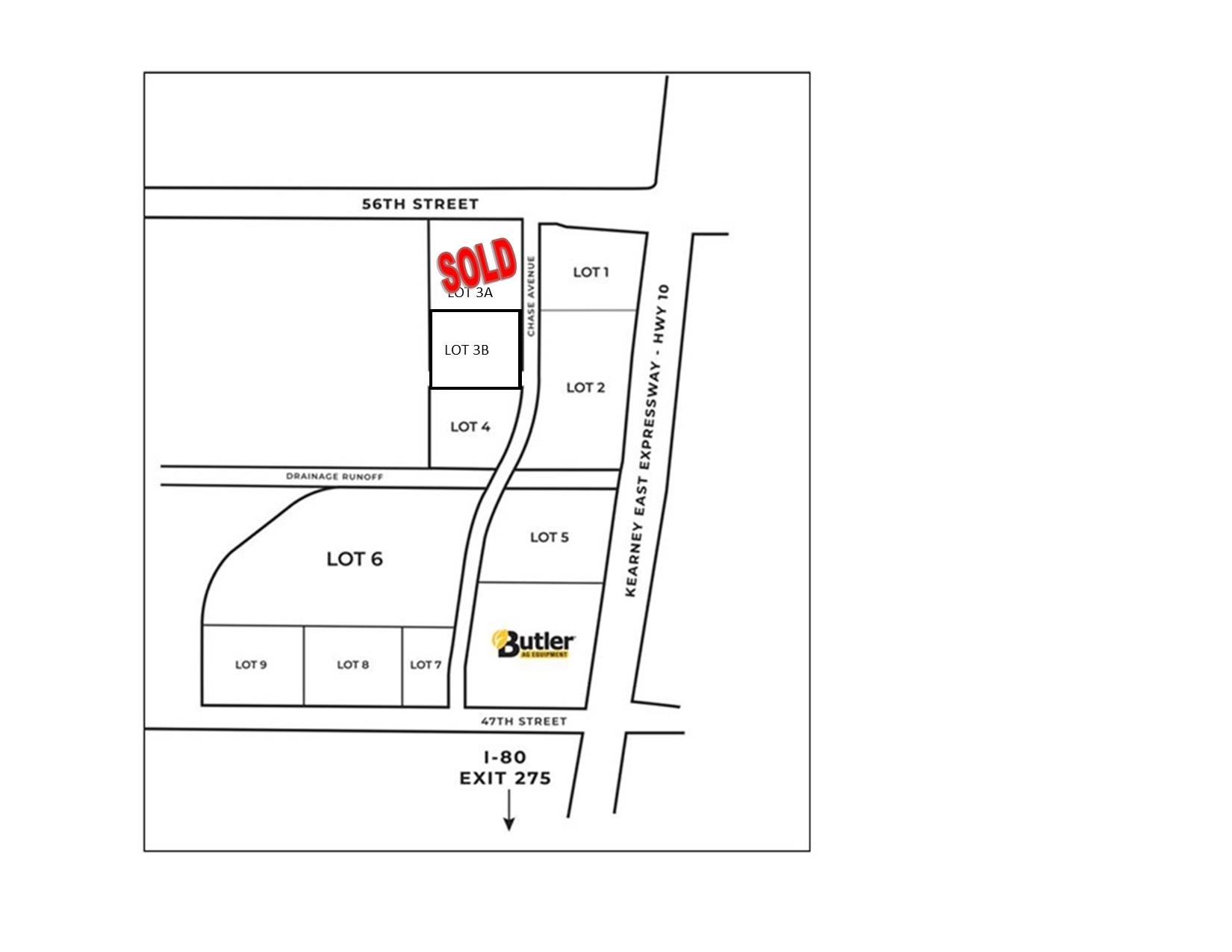 Developing area ready for your business! Join Butler Ag in their new Butler Addition on the east side of Kearney. This development is located in the southwest corner of 56th Street and Kearney Expressway-Hwy 10. This commercial development is near Kearney Regional Airport, Kearney’s Patriot Park (Sports Complex), Central Nebraska Veterans Home, Farm Credit Services of America and Butler Ag Equipment. The entire development will be rezoned to Business Park(BP). Property will need to go in front of the Kearney City Council for final platting and rezoning. Excellent access to I-80. City utilities are available along Chase Avenue. Buyer is responsible for all connection cost. Flexible lot sizes.2-34 Acres, the price for this location is based on a $3.25/sq ft price. Map is for illustration purposes only. Call for more details.