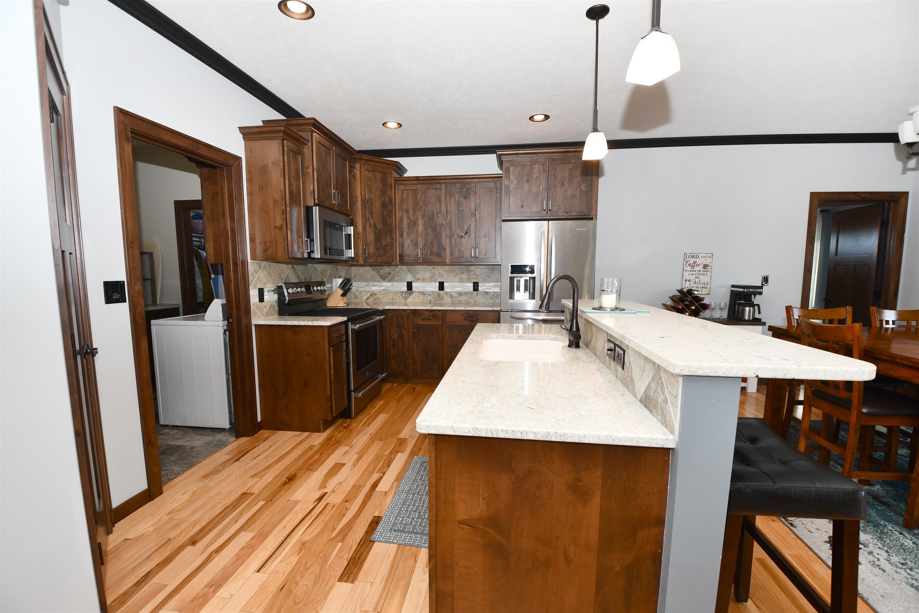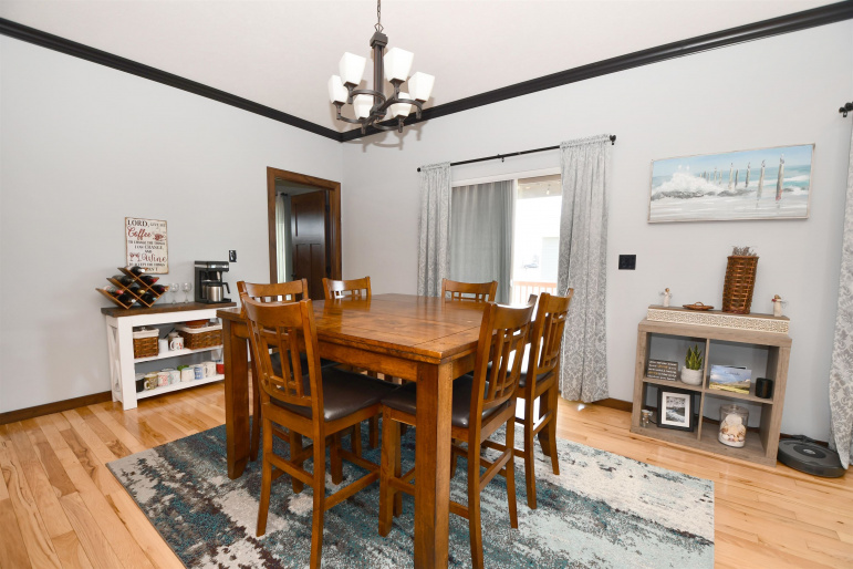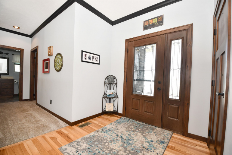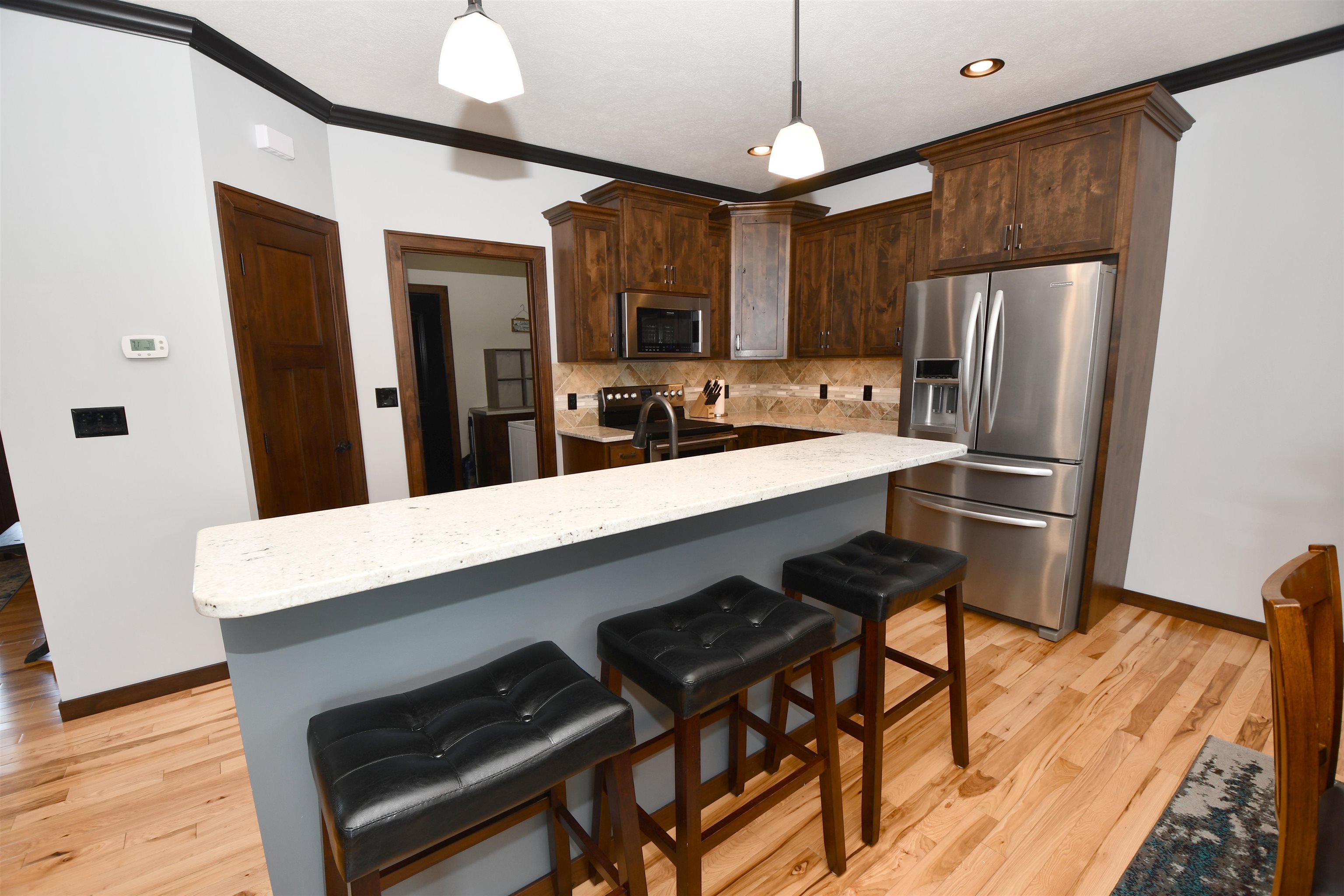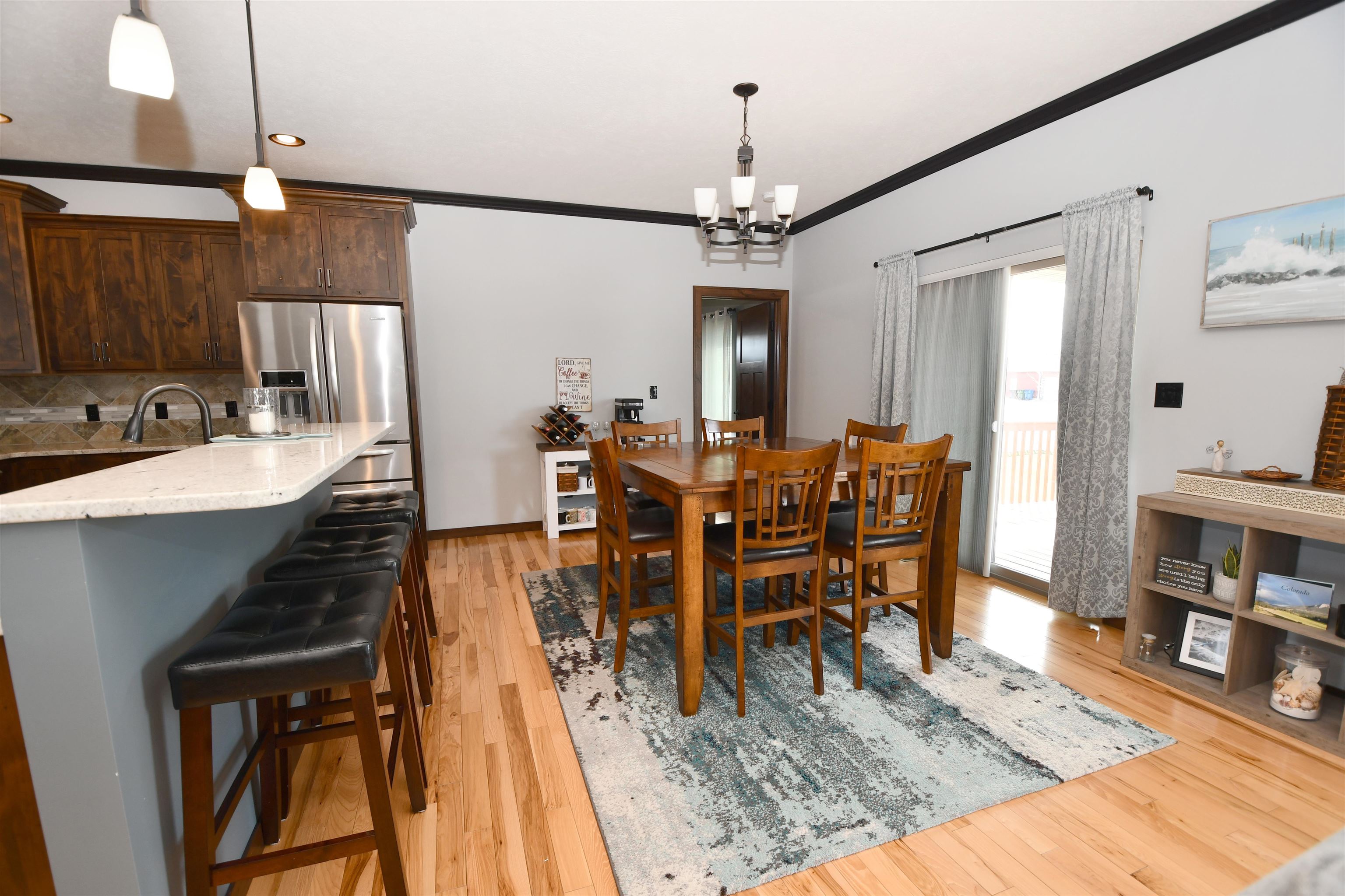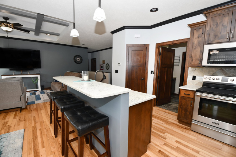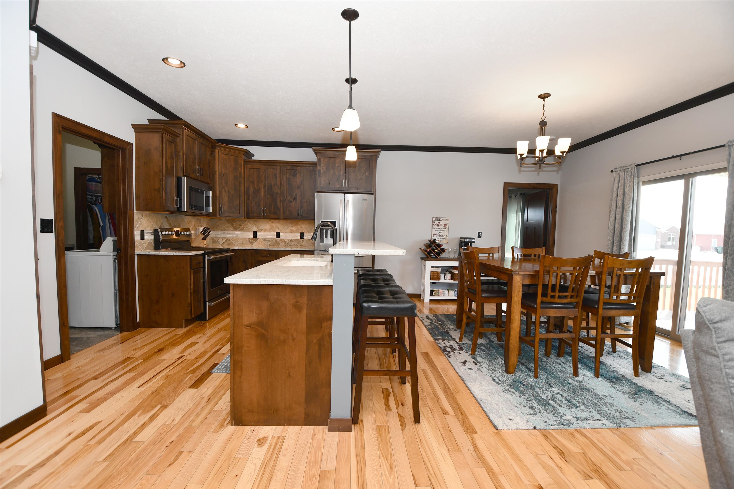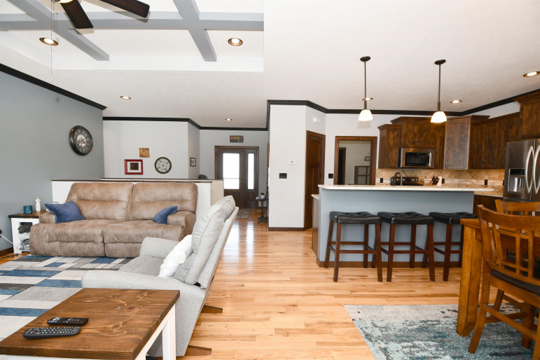 This custom-built, all electric, ranch-style home in northeast Kearney offers zero-entry access and exceptional attention to detail throughout. Featuring 6 bedrooms and 3 bathrooms, the layout is both functional and beautifully designed for everyday comfort and entertaining. The kitchen is a standout, showcasing granite countertops, a walk-in pantry, soft-close cabinetry, tile backsplash, stainless steel appliances, and under-cabinet lighting for an elevated finish. Wood flooring extends through the main living spaces, with an open floor plan that creates seamless flow throughout. The spacious master bathroom offers a tiled walk-in shower, double vanity, and an expansive closet that conveniently connects to the laundry area. Additional highlights include Andersen windows, fully finished 3 car garage, underground sprinklers, large family room, and upkeep that makes this home truly move-in ready. Step outside to enjoy a fully vinyl-fenced yard, professional Curb-It landscaping, a covered deck perfect for relaxing or entertaining, and a storage shed for added convenience. Exceptionally clean, this home is a rare find in a desirable Kearney location.
