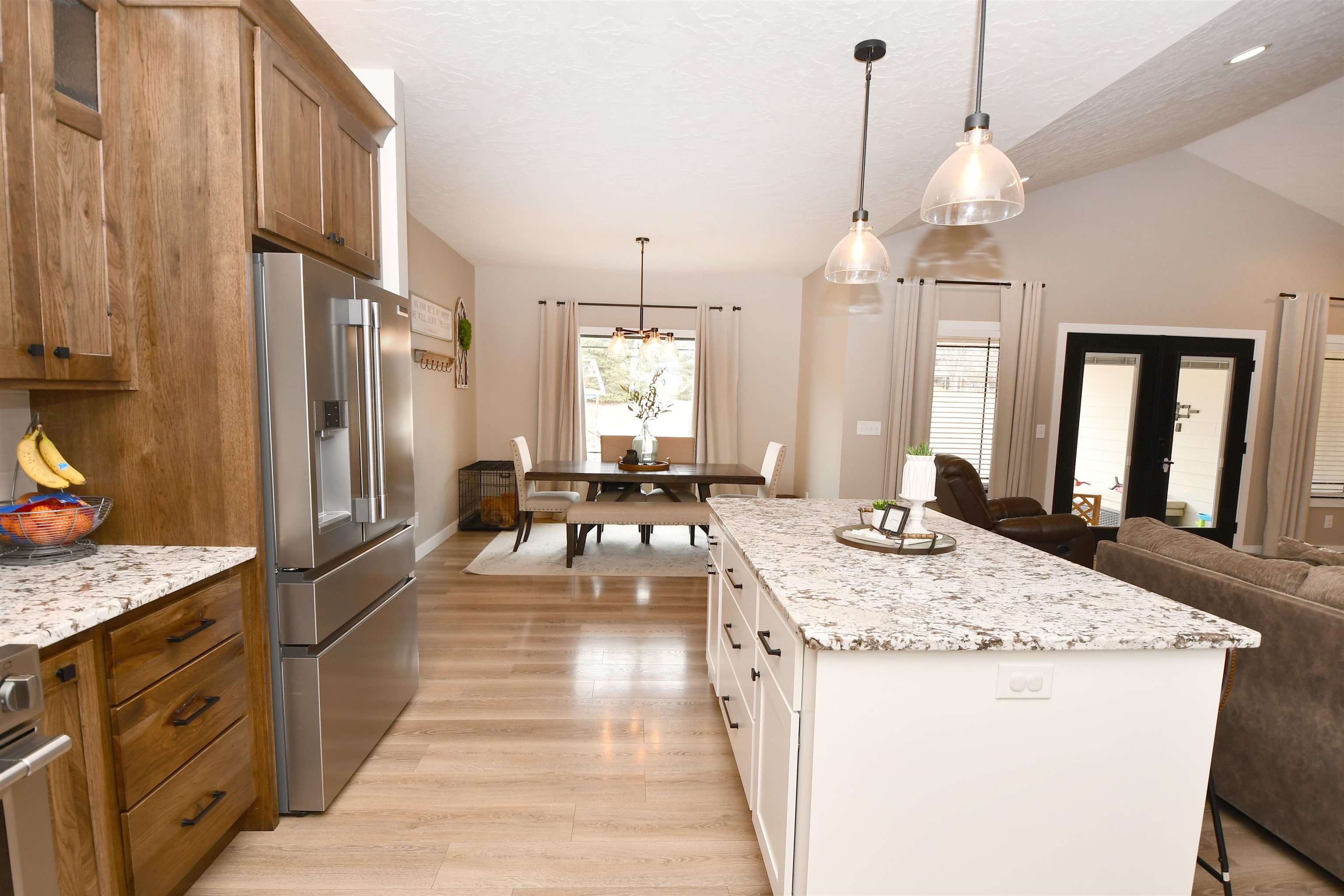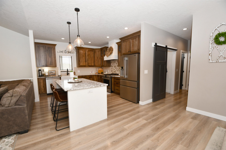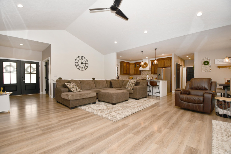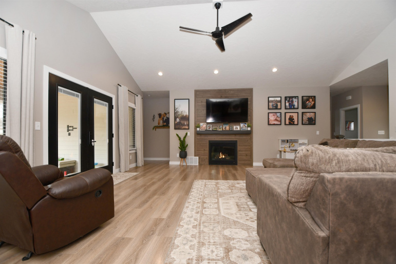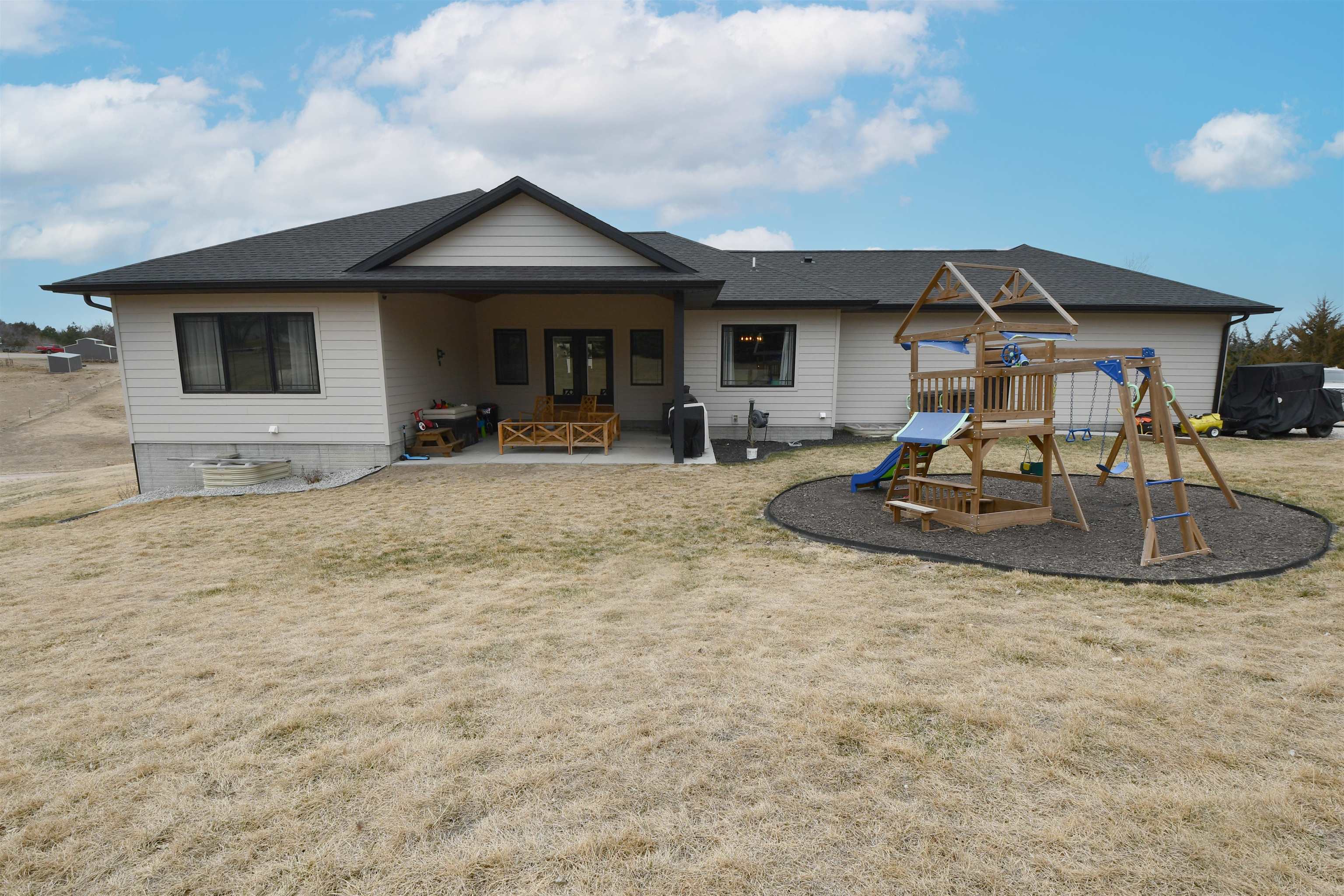 Spacious ranch style home sitting on a 1.02 acre lot Northwest of Kearney! Built in 2022 this home features 6 bedrooms plus an office and 4 bathrooms!! The front entry offers a warm welcome with large French Doors and stained car siding ceiling with can lighting. The main floor has an open concept with two guest bedrooms and a guest bath off the entry way as well as a nice sized office. The living room features a fireplace with space for a TV above. The primary bedroom has a sliding door which guides you into your own private bathroom. There is a double sink vanity, a large soaking tub, a glass front tile shower and a big closet with built in cabinetry. Back to the main living room there is a double door to the covered patio with the same matching car siding and is plumbed for both water and gas. Kitchen features beautiful granite countertops and updated Frigidaire Professional appliances. The dining area has a nice bump out for plenty of space for a table. Down the hall is a massive pantry, a laundry room with extra storage and a bathroom right off the 3 car garage which also has extra space for a workbench. Downstairs the space continues with a large living room and a bar area which has already been started. (seller will leave any supplies they have for the bar area). There are 3 more bedrooms which need minimal finishes to be complete. There is another full bathroom with double vanity sink. A safe/gun room and mechanical room are also on the list for the basement! Other upgrades include a tankless gas water heater, water softener that stays, myQ Garage Door Openers and an electric garage heater. Home is plumbed for a sprinkler system at the well. Make your appointment today! Room sizes are approximate and square footage is according to court house records.
